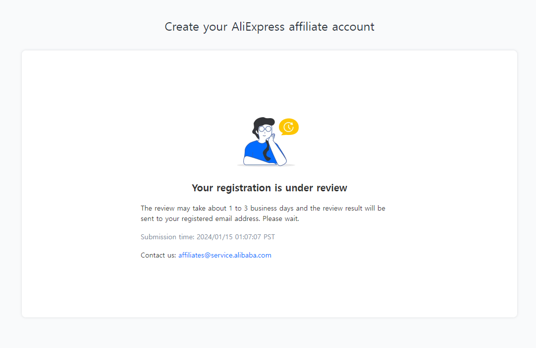 다음과 같은 화면이 나오면 끝입니다. 빠르면 1~3일 내 승인 된다고 합니다. 기다리시다가 너무 늦어진다 싶으면 contact us: affiliates@service.alibaba.com으로 문의하시면 도움 받아보실 수 있습니다.