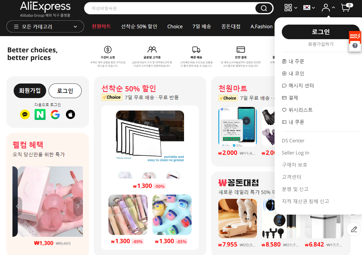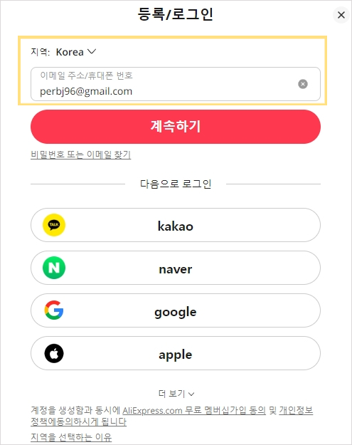 먼저, 알리익스프레스 사이트로 이동한 뒤 우측 상단 계정(account) 클릭 > 회원가입하기 주로 사용하는 메일로 회원가입 진행해주시면 됩니다.