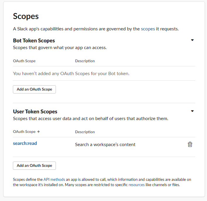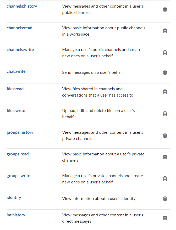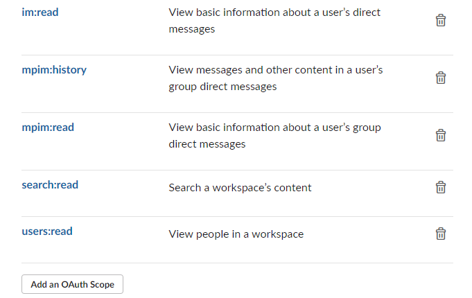 ex) channels:history / search:read 다른 자동화 기능도 사용하게 될 수 있으니 아래 권한 모두 등록해 주셔도 됩니다.