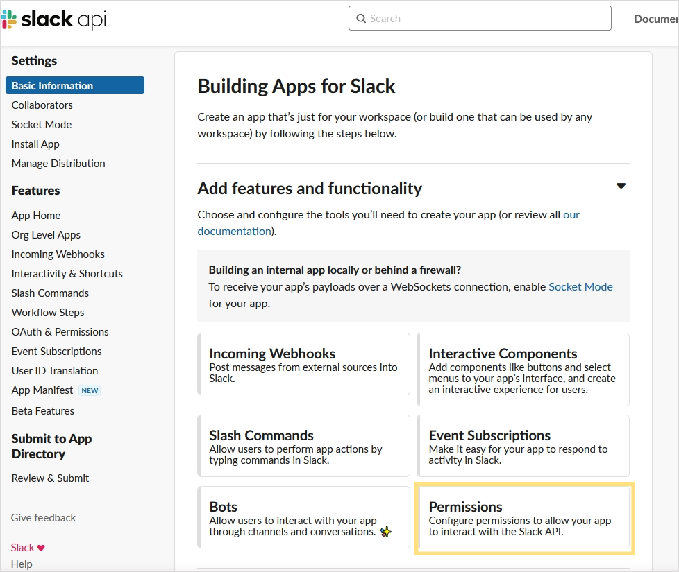 선택해 주세요. 즉 파이썬에서 요청을 보낼 워크스페이스이므로 리마인드를 보낼 채널의 워크스페이스를 선택해 주셔야겠습니다. 선택했다면 create app 선택. 선택하면 아래 화면으로 이동이 됩니다. 이동이 되지 않았다면 좌측 메뉴 settings > basic information를 클릭해 주세요