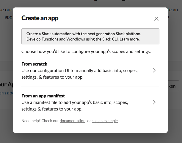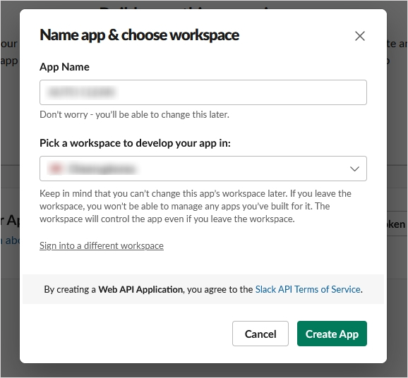 pick a workspace to develop your app in: 은 슬랙 워크스페이스를 의미합니다. 어느 공간에서 자동화 작업을 할 것인지
