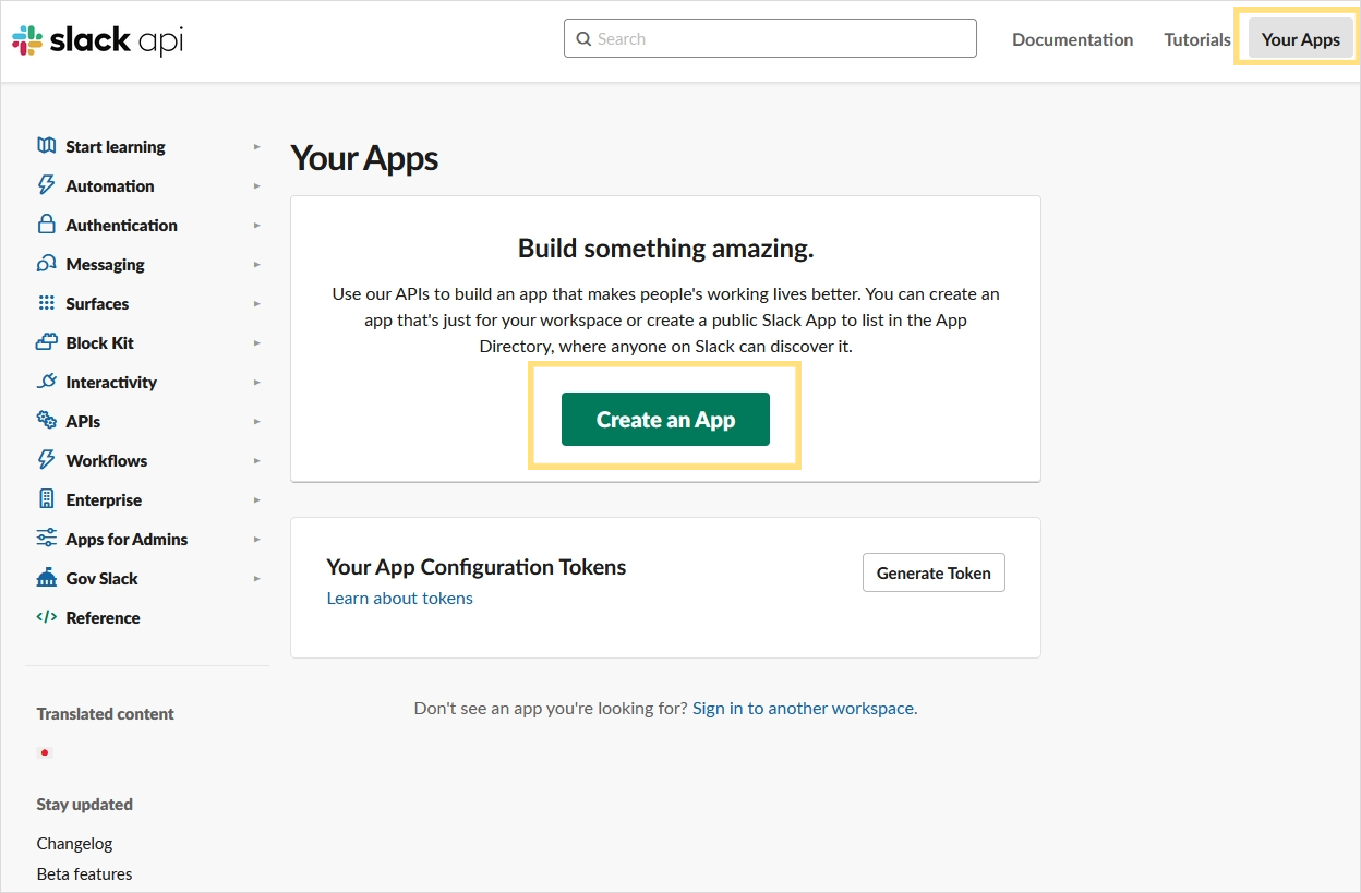 슬랙 API 사이트에 들어가신 뒤 사용하고 계시는 슬랙 계정으로 로그인 해주세요. 계정이 없을 경우 회원가입 후 로그인 하시게 되면 다음과 같이 우측 상단에 Your Apps 가 나오게 됩니다. Your Apps 클릭 후 Create an App 클릭해주세요