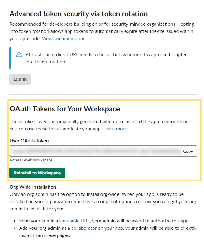 그러면 해당 칸에 User OAuth Token 칸이 아래 뜨면서 값을 복사할 수 있게 됩니다. 해당 값은 xoxp-0000000-0000 · · 형식으로 되어 있을 것입니다. 해당 값을 파이썬 slack api 값에 입력해야 하기 때문에 메모장에 복붙 하거나, 따로 기입해두시길 바랍니다.