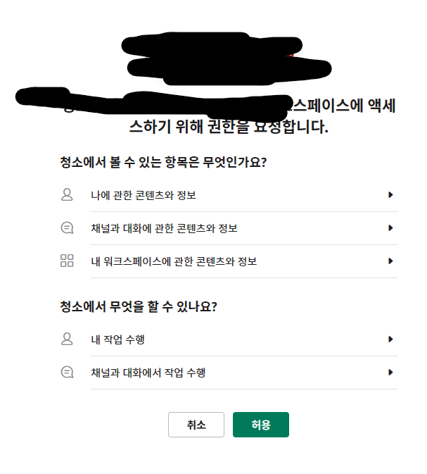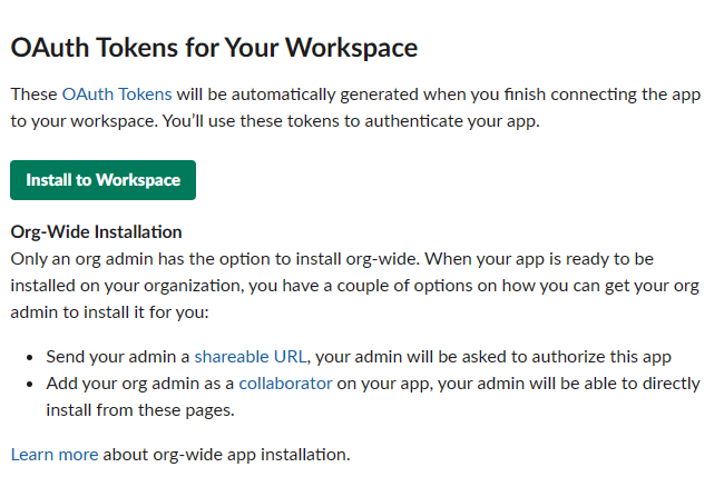 등록하고 난 뒤 OAuth Tokens for Your Workspace를 찾아 아래 초록색 버튼의 Install to Workspace를 눌러주세요. 그러면 액세스 권한 요청 창이 나오게 되는데요 이때 허용 눌러주세요
