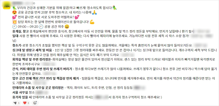슬랙으로 리마인드 된 메시지입니다. 해당 메시지는 매주 금요일 09시가 되면 제가 특정한 채널로 자동 발송이 되는데요. 해당 값들은 변수로 순환되기 때문에 멘트만 바꿔서 청소가 아닌 다른 리마인드로 활용도 가능합니다. 정기적으로 변경되는 것을 굳이 손으로 변경해 가면서 할 필요가 없는 것이죠!