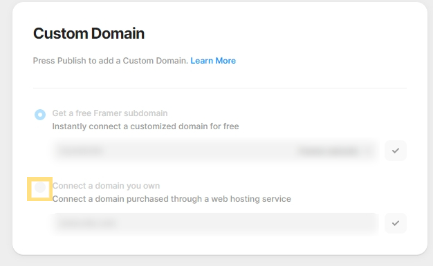 custom domain에 결제를 하지 않았다면 위 화면처럼 비활성화 되어있습니다. 플랜을 결제 하면 아래 화면처럼 connect a domain you own을 클릭을 할 수 있도록 변경됩니다. 저곳에 구매한 도메인 주소를 입력하면 됩니다.ex)www.perbj96.com 이런식으로 말입니다. 그 후 우측 체크를 눌러주세요
