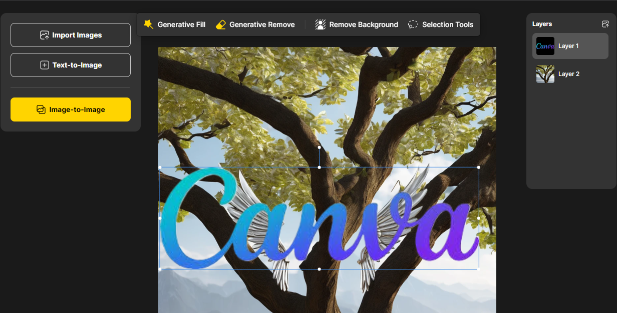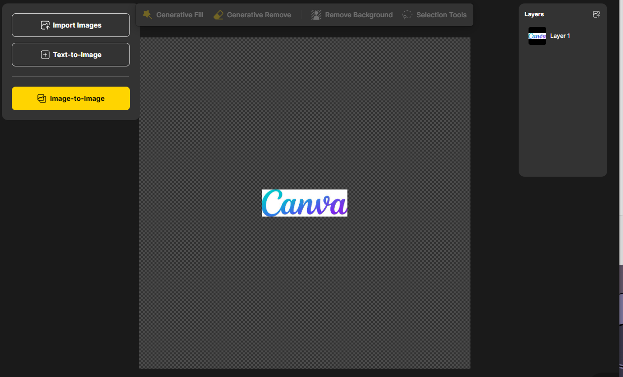 로그인을 하면 위 해당 화면으로 이동합니다 recent projects 하위 'New project'를 선택해주세요. 이때 우리는 베이스가 되어줄 로고가 필요한데요. 구글에서 원하는 로고를 png버전으로 다운받아서 준비해줍니다. 'New project' 를 누르면 Roading 이후 Project name 창이 나오는데요 좌측 상단의 Import Images 버튼을 선택해 로고를 업로드해줍니다. 저는 제가 좋아하는 canva 로고를 사용했습니다. 업로드 후 좌측 매뉴 하단의 Image-to-Image 버튼을 선택해줍니다.