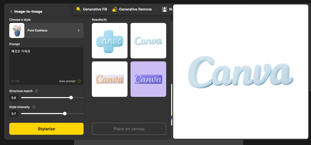 캔버스를 클릭하면 상단에 generative fill 기능과 generative remove 기능이 있는데 영어로 요청을 했지만 제 사용법이 미숙한 것인지는 몰라도 인식률이나, 완성도가 다소 떨어지는 것 같습니다.
